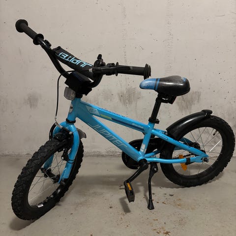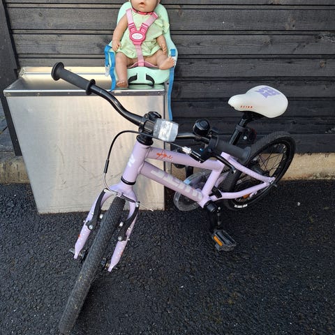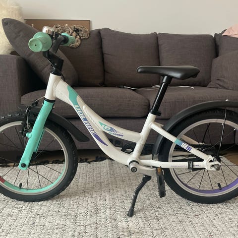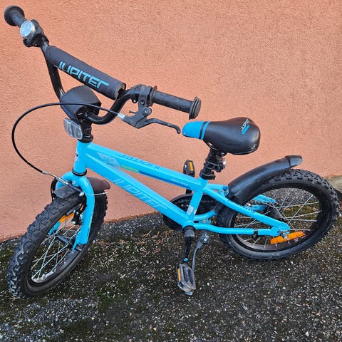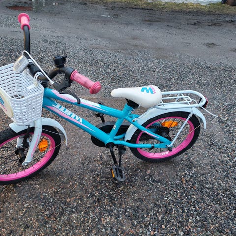 Lasten polkupyörä jonka kunto käytännössä muuten moitteeton paitsi polkimet ja takavanteen mutterien päät kuluneet kun pyöräilyä harjoiteltu alusta alkaen ilman apupyöriä. Loistava pyörä aloittaa keveytensä vuoksi.