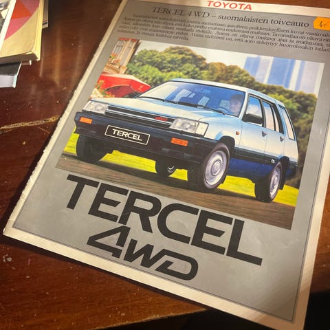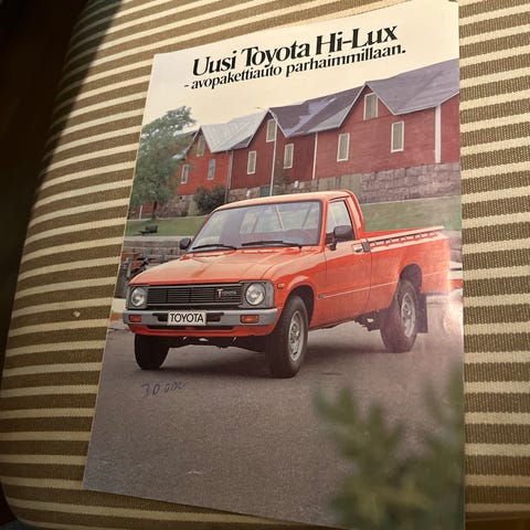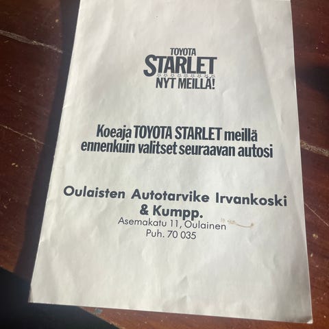Toyota varusteet esite. Painettu esite, jossa esitellään eri Toyota-mallien lisävarusteita, kuten vanteita, ohjauspyöriä, kattotelineitä ja muita varusteita. Sisältää värikuvia useista Toyota-henkilö- ja pakettiautomalleista sekä niiden saatavilla olevista varusteista. Sopii esimerkiksi harrastajalle tai arkistointiin automateriaaleja keräävälle.