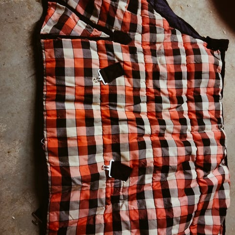 Bucas kaulakappaleellinen toppaloimi. En muista kuinka paksu. Erittäin paljon käytetty ja paikkailtu sieltä täältä ja saattaa olla pieniä reikiä.