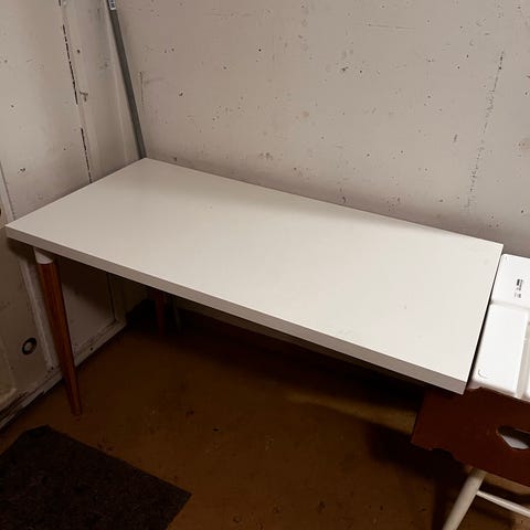 IKEA Valkoinen suorakulmainen pöytälevy, joka on asennettu kahden mustan pukkijalan varaan. Pöytälevy on sileäpintainen ja sopii esimerkiksi työpöydäksi tai askartelupöydäksi. Mustat puidet pukkijalat muodostavat A-muotoisen rungon ja tukitangon, mikä antaa pöydälle vakautta. Kokonaisuus sopii sisäkäyttöön ja neutraalin värityksen ansiosta monenlaisiin sisustuksiin. 150x75 korkeus 75. Pöytiä on 4kpl.