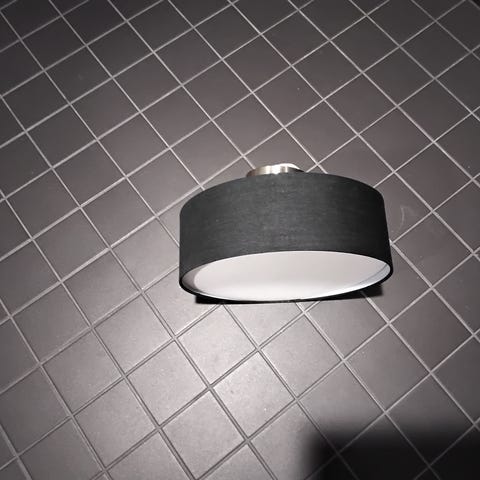 Trio Hotel kattovalaisin, jossa musta kangasvarjostin ja valkoinen diffuusori. Valaisimessa on kolmen lampun kanta sisäpuolella, mikä antaa tasaisen yleisvalon. Halkaisija 50 cn, korkeus 12 cm.