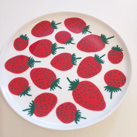 Kuvanmukaiset tuotteet Marimekon mansikka muki, tarjoilulautanen ja keittiöpyyhe. Kaikki uusia, käyttämättömiä. Hinta 13 €/ kappale tai kaikki yhteensä 35€