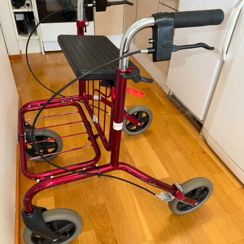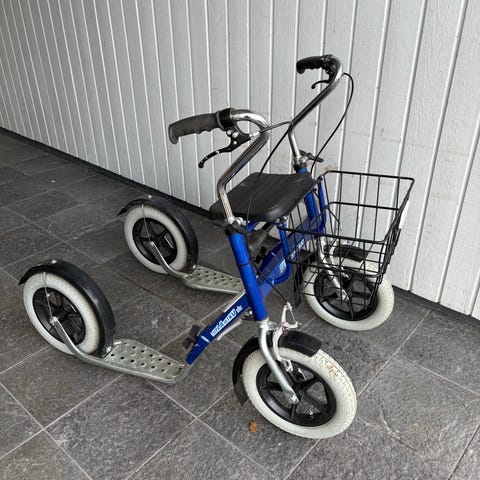 Tuplapotku rollaattori, jossa metallinen runko ja sininen väri. Rollaattorissa on etukori tavaroiden kuljettamiseen, neljä pyörää sekä seisoma- ja istuinalusta keskellä. Korkeat kahvat tarjoavat tukevan otteen liikkumisen tueksi. Soveltuu hyvin ulkoiluun hyvät säädöt eri mittaisille kulkioille.