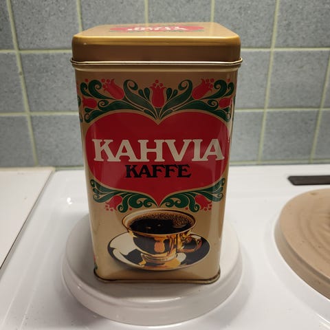 Vanha kahvipurkki ja kahvinpaahdin koriste-esineiksi