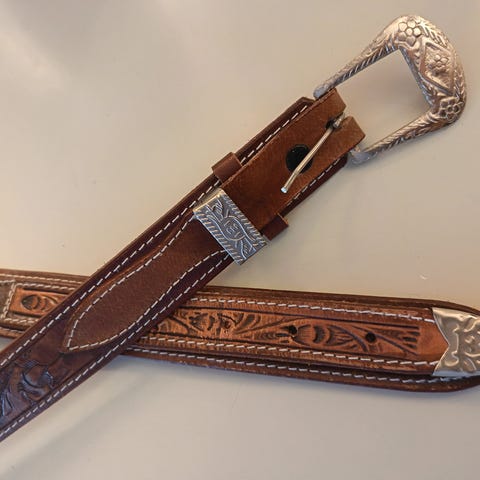 3. Vaalean ruskea leveä vyö, pieni huomaamaton vika reunassa, muuten hyvin siisti, keinonahkaa, punoksella päällystetty solki, pituus solkineen 101 cm, vyön leveys 5,5 cm, reikien mahdollistama vyötärön ympärysmitta n. 78-89 cm. Hinta 3 e.