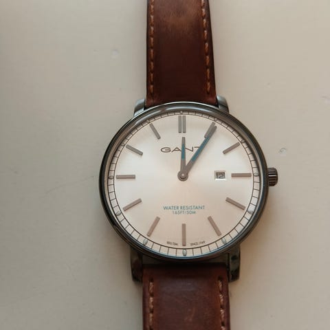 Gant miesten rannekello metallirannekkeella. Kellossa on tumma, musta kellotaulu ja selkeät indeksit. Ranneke on metallinen linkkiranneke, väriltään kultainen tai kullanhohtoinen. Kellotaulussa on erillinen pienempi näyttö sekuntiosoitinta varten. Sopii miehille arki- ja pukukäyttöön.