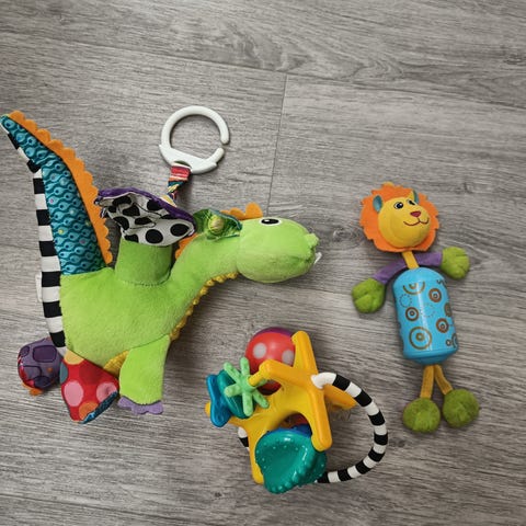 Vauvan "karuselli" päältä painetaan niin eläimet ja pallot sisällä pyörii. Naarmuja löytyy, muuten ehjä ja siisti