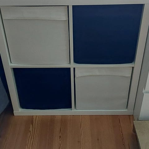 Myynnissä siistikuntoinen Ikean Kallax hyllykkö ja siihen upotettavat laatikostot ja kaapit.