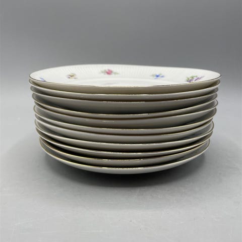 Arabia Kristiina pulla/leivoslautaset 11kpl, joissa on kukkakuviointi ja kultareunus. Pohjissa Arabia massaleima ja Made in Finland