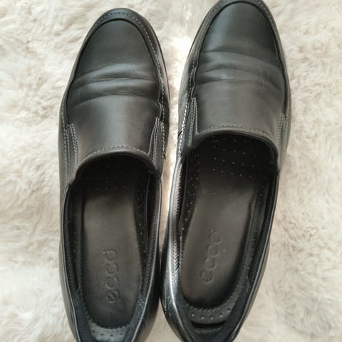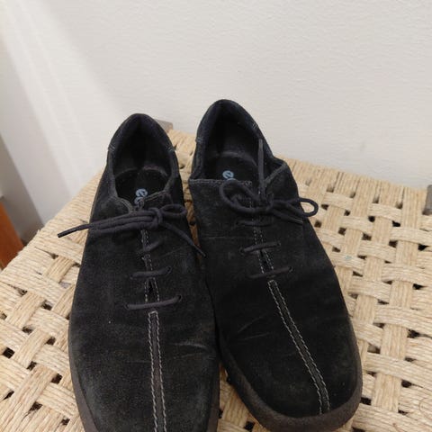 Eccon kävelykengät, koko 41. Tummansiniset nahkaiset kengät, joissa vaaleat nauhat ja sivuilla raidalliset yksityiskohdat. Kumipohja tarjoaa hyvän pidon. Sopivat arkikäyttöön ja vapaa-aikaan.