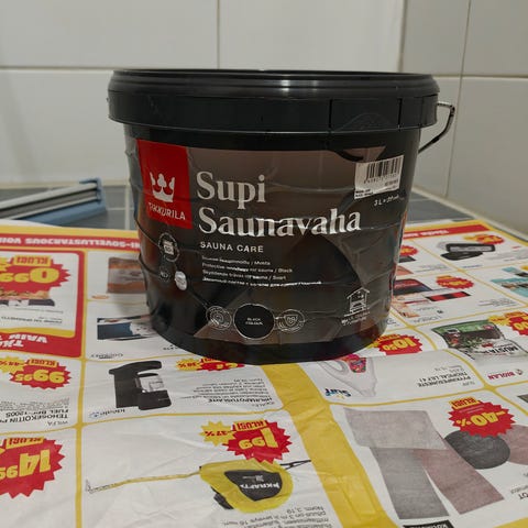 Lähes täysi 0,9l purkki Tikkurilan Supi saunavahaa sävyssä nokirousku.