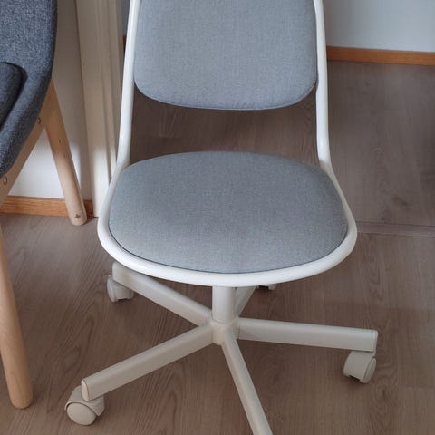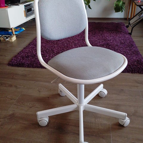IKEA lasten tuoli sininen. Puinen, sininen pinta. Jalustassa on viisihaarainen metallinen ristikko ja pyörät, jotka helpottavat tuolin siirtelyä. Istuimen korkeutta voi säätää. Sopii esimerkiksi lasten työpöydän tai kirjoituspöydän tuoliksi.