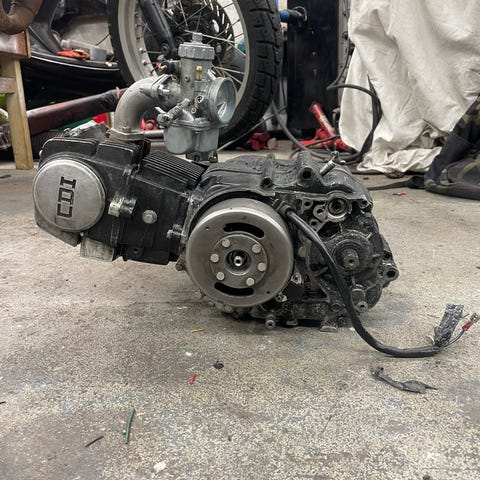 Tästä jollekin 125cc Lifan. Seissyt autotallissa nyt varmaan vuoden. Puristuksia on hyvin. En tiedä toimiiko staattori joka on kiinni juuri nyt. Ei ole tietoa tunneista tai kilometreistä.