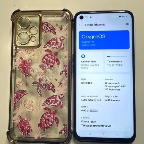 Muutaman vuoden vanha OnePlus myyntiin apple-kokeilun vuoksi. Toimiva puhelin. Takalasissa halkeamia niinkun kuvasta näkyy. Mukaan alkuperäinen laatikko ja silikonikuori. Näyttöön laitettu juuri äsken uusi paksu näytönsuojakalvo.