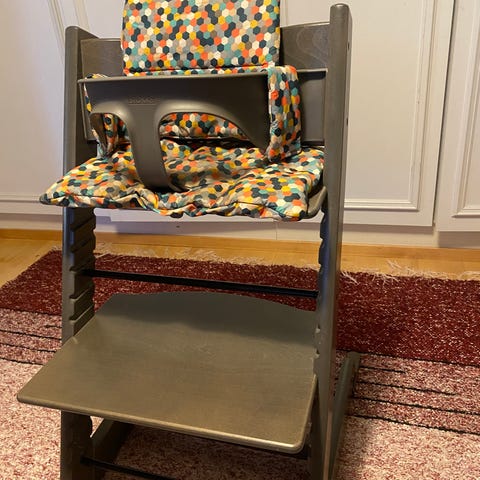 Saa säädettyä moneen kokoon ja toimii lisäosilla jo vauvasta asti. (Huom. tuoli arviolta +10 vuotta vanha, uusin muovinen babyset tuskin sopii yhteen. Vauvana meillä ollut käytössä Stokken puinen kaari ja pehmusteet, nämä jo myyty pois)