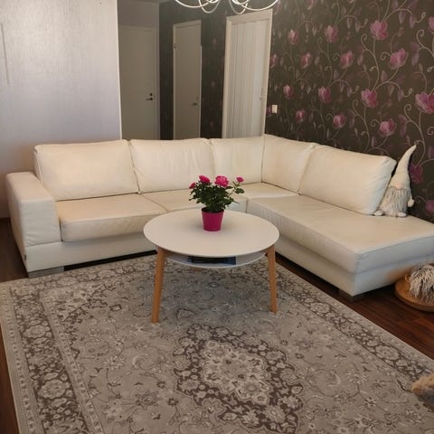 Isohko kulmasohva, jossa leveät istuimet mukavaan löhöilyyn.