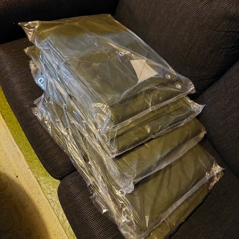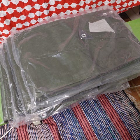 Myydään kuvassa oleva 6x10m 160g/m2 hopeinen kestopeite. Alumiiniset purjerenkaat reunoilla ja muoviset kulmavahvikkeet.