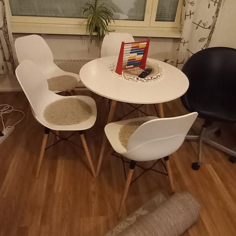Muuten moitteettomassa kunnossa, jalkojen sisäreunoista on maali hieman kulunut, kun tuolit osuneet. Näistä ”kulumista” kuvat ilmoituksessa. Ei huomaa käytössä tai muutenkaan, ellei erikseen katso.