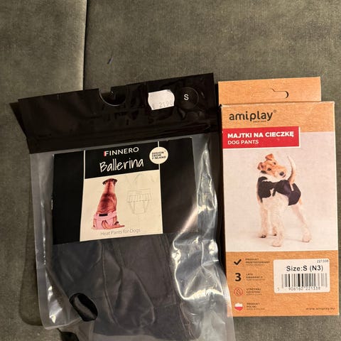 2kpl Finneron ballerina-juoksuhousuja koiralle koossa XS, sopii noin 5kg koiralle. Muutamia kertoja käytetty ja pesty. Hinta yht. 10e.