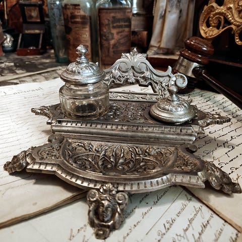 Laatikon sisältö yli 20 työkalua muodostavat täydellisen pienen kaivertajan arsenaalin. Laatikosta löytyymm. puiset messinkipäiset leimasintyökalut, metalliset stanssit, kirjasimet, sekä pienet apuvälineet, joilla valmistettiin sinettejä, merkintöjä ja yksilöllisiä leimoja. Mukana olevat painot ja lisäosat viittaavat työskentelyyn, jossa tarvittiin sekä tarkkaa kohdistusta ja hienovaraista käsityötä. Jokainen osa on aseteltu omalle paikalleen, kuten työpajassa, jossa järjestys oli osa ammattiylpeyttä. Harvinainen kohde, kaikki yli 20 osaa säilyneet!