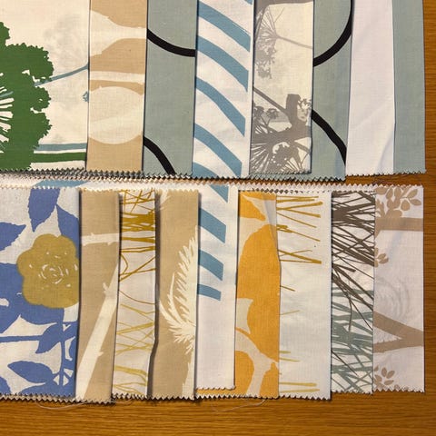 Tilkkutöihin värikkäitä, raidallisia kangaspaloja, koko 25 cm x 13 cm, kuosi Onnellinen.