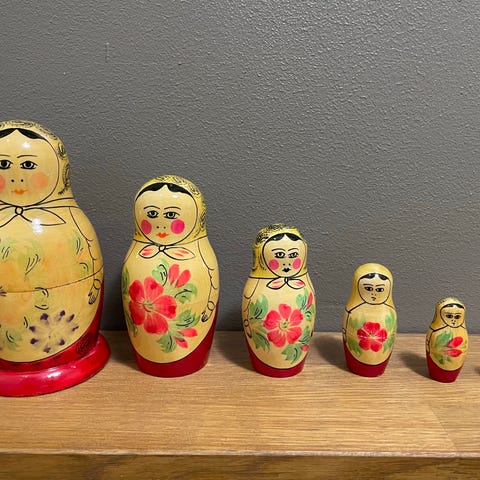 Puinen maatuska-nukkesarja, jossa useita sisäkkäin meneviä nukkeja. Nukeissa on punaiset päähineet ja kullanvärisiä koristeita sekä rakennusaiheisia kuvioita. Pinta on maalattu käsin ja yksityiskohdissa on käytetty glitter-koristelua. Sopii koriste-esineeksi tai keräilykohteeksi.