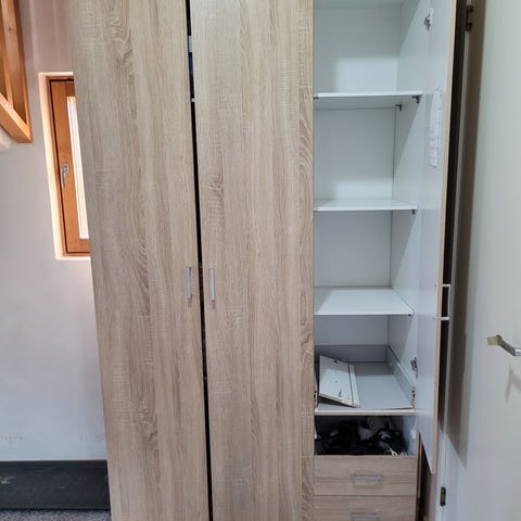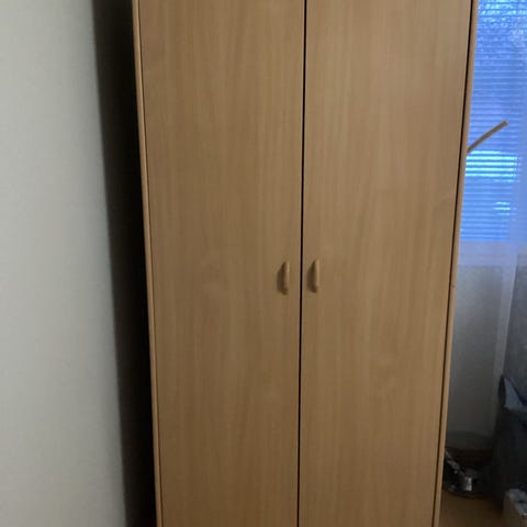 Annetaan vaatekaappi, kuvista näkee ettei ole ihan priima kuntoinen, ehjä kuitenkin.