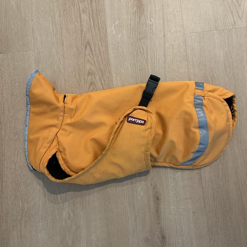 Ruskea koiran takki karvavuorella. Takki on ehjä, mutta löytyy pientä kulumaa ja valkoista koirankarvaa, joka ei lähtenyt pesussa.