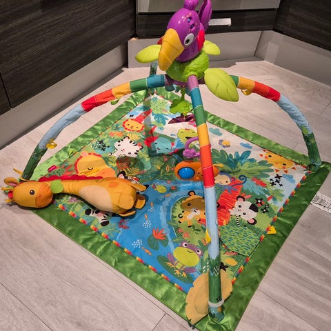 Fisher-Price leikkimatto ja pehmolelu. Pehmeä, monivärinen leikkimatto, jossa on kaaret ja useita roikkuvia leluja, kuten peili, pehmeitä eläinhahmoja ja helistimiä. Mukana erillinen pehmustettu tuki- tai lepotyyny sekä Fisher-Price pehmokoira. Soveltuu vauvan lattialeikkeihin ja ensileikkeihin, tukee motoriikan ja aistien kehitystä.