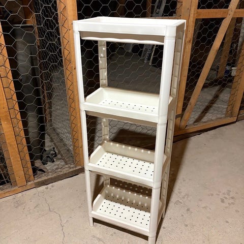 Valkoinen muovinen hyllykkö, jossa useita tasoja säilytystä varten. Soveltuu esimerkiksi kylpyhuoneeseen tai kodinhoitotilaan pyyhkeiden, pesuaineiden tai muiden tarvikkeiden järjestämiseen. Yläosassa on korimainen kehikko, joka auttaa pitämään esineet paikoillaan. Hylly on kevyt ja helposti liikuteltava.