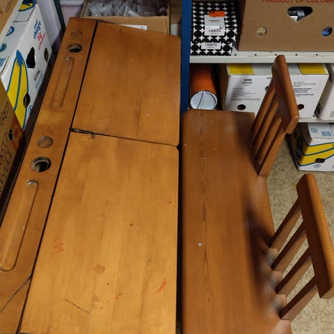 Vanha puinen koulupöytä/pulpetti, jossa ylös nouseva kansi ja kannen alla säilytystilaa esimerkiksi kirjoille ja vihkoille. Pöydässä on lisäksi pieni vetolaatikko sivussa. Materiaalina lakattu puu, luonnonvärinen pinta. Sopii työpöydäksi tai pieneen tilaan kirjoituspöydäksi. Pöydän sisäpuolella on valmistajan leima, tarkempi merkki ei ole luettavissa. Korkeus n. 65cm matalammalta reunalta.