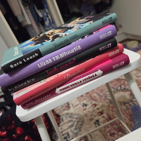 Adele Broadbentin Liikaa salaisuuksia on kovakantinen nuortenkirja. Kirja kuuluu GIRL-IT -sarjaan. Kansi on monivärinen, pääväreinä violetti ja pinkki. Teos sopii erityisesti nuorille lukijoille, ja se käsittelee salaisuuksia ja ystävyyssuhteita. Kirja on suomenkielinen ja siinä on perinteinen painettu teksti.