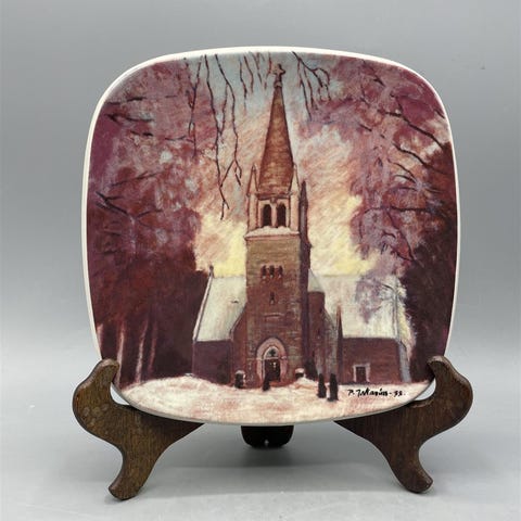 Nilsiä lautanen 1988, taiteilija Pentti Iskanius. Kuvassa Nilsiän goottilaistyylinen kvartsiittikivikirkko 1800-luvulta.
