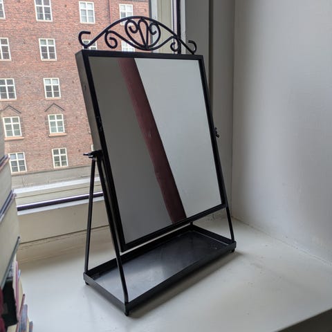 IKEA Tysnes pöytapeili metallijalalla. Peilissä on suorakulmainen peiliosa ja kiinteä, taakse taittuva metallinen jalusta, joka mahdollistaa peilin asettamisen tasolle ilman erillistä kiinnitystä. Sopii esimerkiksi kylpyhuoneeseen, makuuhuoneeseen tai eteiseen pöydälle tai tasolle asetettavaksi peiliksi.