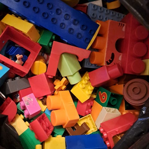 Myydään setti jätti isoja ensi Duploja. Ukkojen päät liikkuvat, pari palikkaa helisee.