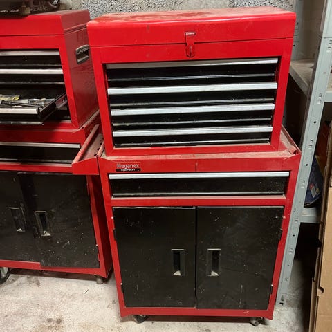 Metallinen työkalukaappi, jossa useita vetolaatikoita ja yläosa kannella. Kaapissa on useita eri kokoisia laatikoita pientyökalujen ja tarvikkeiden säilytykseen sekä lukittava alaosa. Ulkopinnoissa on tarroja. Soveltuu esimerkiksi autotalliin tai verstaaseen työkalujen järjestelmälliseen säilytykseen.