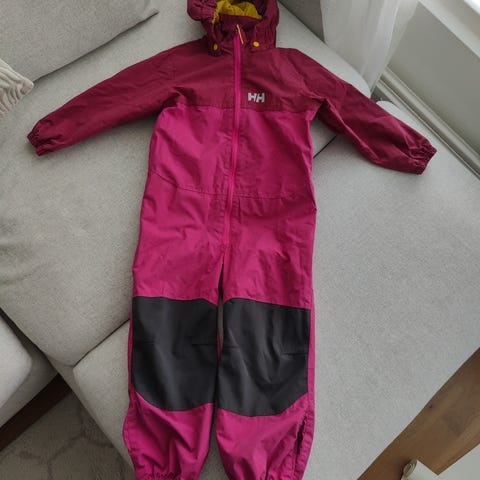 Meille kakkoshaalariksi ostettu päikkykäyttöön (nimikoitu, sutattu) Helly Hansenin vk-haalari. Paristi vain käyttöön ennättänyt, polven kohdalla jotain mutaa ei siis pesty. Kuitenkin todella hyvässä kunnossa. Likka käytti mieluummin takki ja housut kokonaisuutta. Peppu siisti ja polvetkin kun pesee 🙂 104cm.