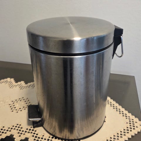 Poljinroskis, jossa on musta metallirunko ja vaalea puukansi. Roskiksessa on jalkapoljin kannen avaamista varten. Sopii esimerkiksi kylpyhuoneeseen, WC-tilaan tai keittiöön kotitalousjätteelle. Helppo sijoittaa lattialle seinän viereen tai nurkkaan.