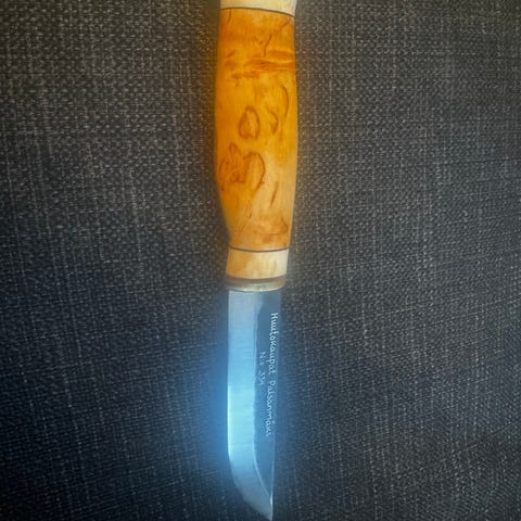 Puukko, jossa puinen kahva ja metalliterä. Terä on suoraprofiilinen ja yksiteräinen. Kahvassa on metallinen hela terän juuressa. Mukana tulee muotoiltu nahkatuppi, jossa on vyölenkki kiinnitystä varten. Soveltuu yleiskäyttöön esimerkiksi retkeilyssä ja puutöissä käyttäjän tarpeen mukaan. Nouto sovitusta paikasta.