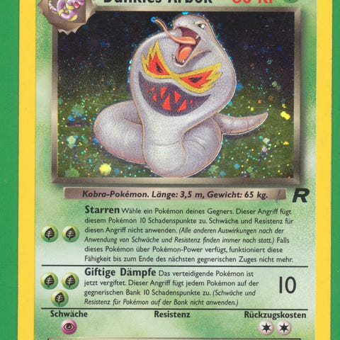 Pokémon Arbok keräilykortti. Kortissa on Arbok-hahmo ja pelitiedot, kuten hyökkäykset ja voimakkuus. Sopii Pokémon-korttipeliin tai kokoelmaan lisättäväksi.
