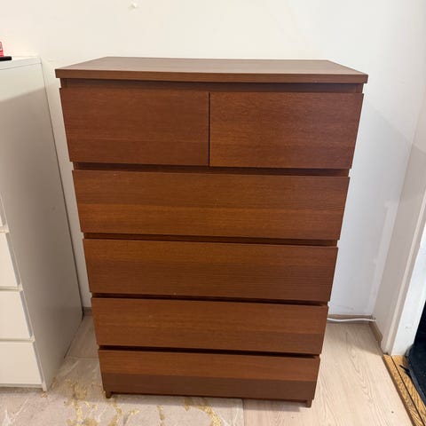 Lipasto on painava. Kuljetuksen aikana laatikot liukuivat maata pitkin, mikä aiheutti hieman kulumaa. Toinen laatikko on lähellä viereistä laatikkoa ja ne avautuvat hieman yhdessä. Lipasto tarvitsee pientä korjausta.
