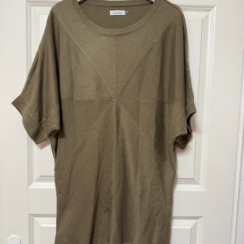 Myydään Calvin Klein neulemekko, koko S, mutta aika reilu. Helman korkeus 98 cm, kainalosta kainaloon mitta 53 cm. Väri tumma beige, kaukuksessa brideerattu CK. Pidetty muutaman kerran, pesty kerran. Kunto kuin uusi.