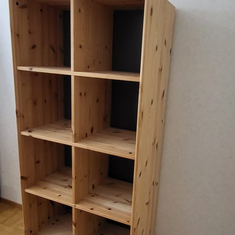 Kaunis ja kevyt Jyskin - hyllykkö tammenvärisillä levyillä.