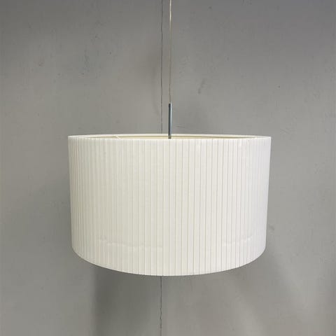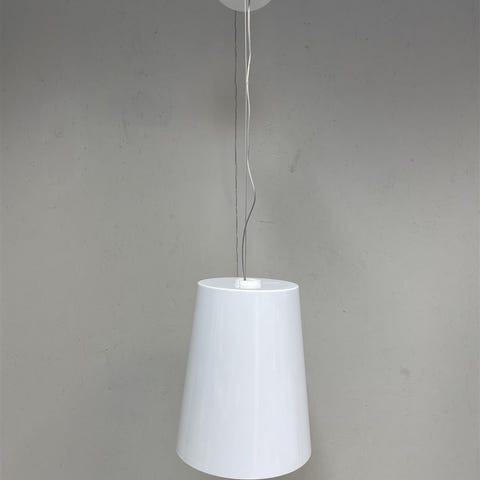 Valkoinen riippuvalaisin, jossa on yksinkertainen ja moderni muotoilu. Johdon pituutta voi säätää.Tämä valaisin edustaa modernia tyyliä, joka sopii monenlaisiin sisustuksiin. Sen pelkistetty muotoilu tekee siitä ajattoman valinnan.Valaisimessa on havaittavissa pieniä käytön jälkiä ”lommoja”
