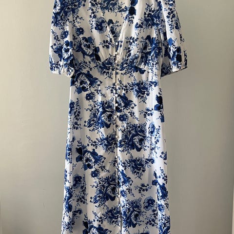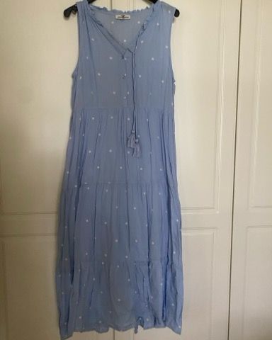 ”Finnwear naisten kesämekko koossa S. Mekko on sininen ja valmistettu 100 % puuvillasta. Mallissa on V-pääntie, puolipitkät hieman pussimaiset hihat ja vyötäröllä kiristettävä nauha. Helma on pitkä ja levenevä, jossa on poimutettu frillahalkio. Sopii käytettäväksi kesämektona arkeen ja vapaa-aikaan.”