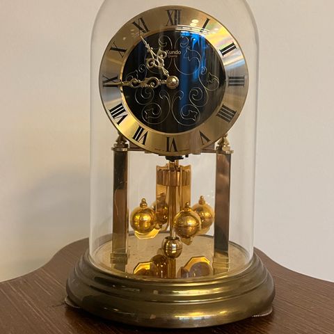Myydään erittäin siisti ja tunnelmallinen klassinen pöytäkello. Kellossa on kaunis tummanruskea puukuvioinen runko ja lasiset sivupaneelit, joista näkee koneiston ja pyörivän heilurin.