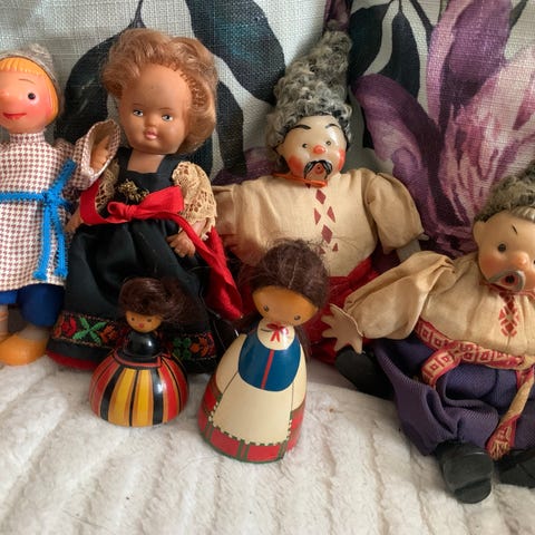 Kokoelma erilaisia kansallispukuisia nukkeja. Nuket esittävät eri maiden ja alueiden perinneasuja, kuten mekkoja, esiliinoja, huiveja ja hattuja. Materiaalit vaihtelevat, mukana on sekä kangas- että muovinukkeja. Sopii esimerkiksi keräilyyn, rekvisiitaksi tai sisustuselementeiksi. Myydään yhtenä eränä kuvien mukaisesti. Myös postitus , haku Heinävaarasta tai toimitus Joensuuhun omien menojen mukaan.