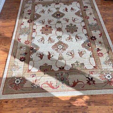 IKEA villalankamatto luonnonvaalea, maton koko on 165x240 cm. Matto pesetetty pesulassa ja sen jälkeen ollut muovipussissa varastossa, nyt avattu kuvausta varten, siksi langat painuneet, pöyhistyy varmaan käytössä.