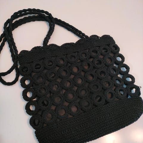 Olkalaukku, musta. Pitkä hihna. Tilava, mahtuu vaikka läppäri laukkuun.
