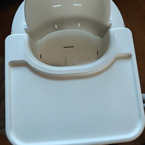 Stokke steps syöttötuolin tarjotin. Väri valkoinen, hyvässä kunnossa mutta käytön jälkiä on (naarmuja).
